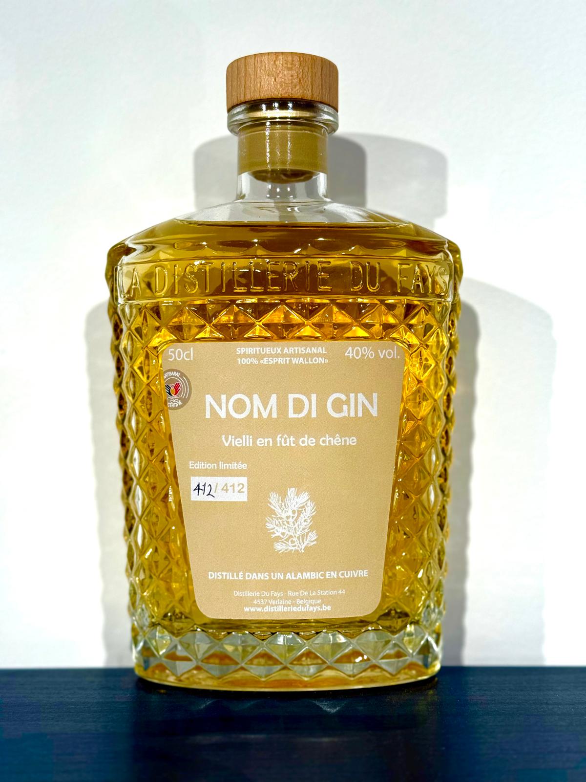 NOM DI GIN est un gin belge artisanal distillé, vieilli 3 ans en fût de chêne. Il dévoile une robe dorée, des notes boisées et vanillées, soutenues par le genévrier et la bergamote. Un gin de dégustation élégant et gourmand, produit en Wallonie, région de Liège, disponible en bouteille de 50 cl.